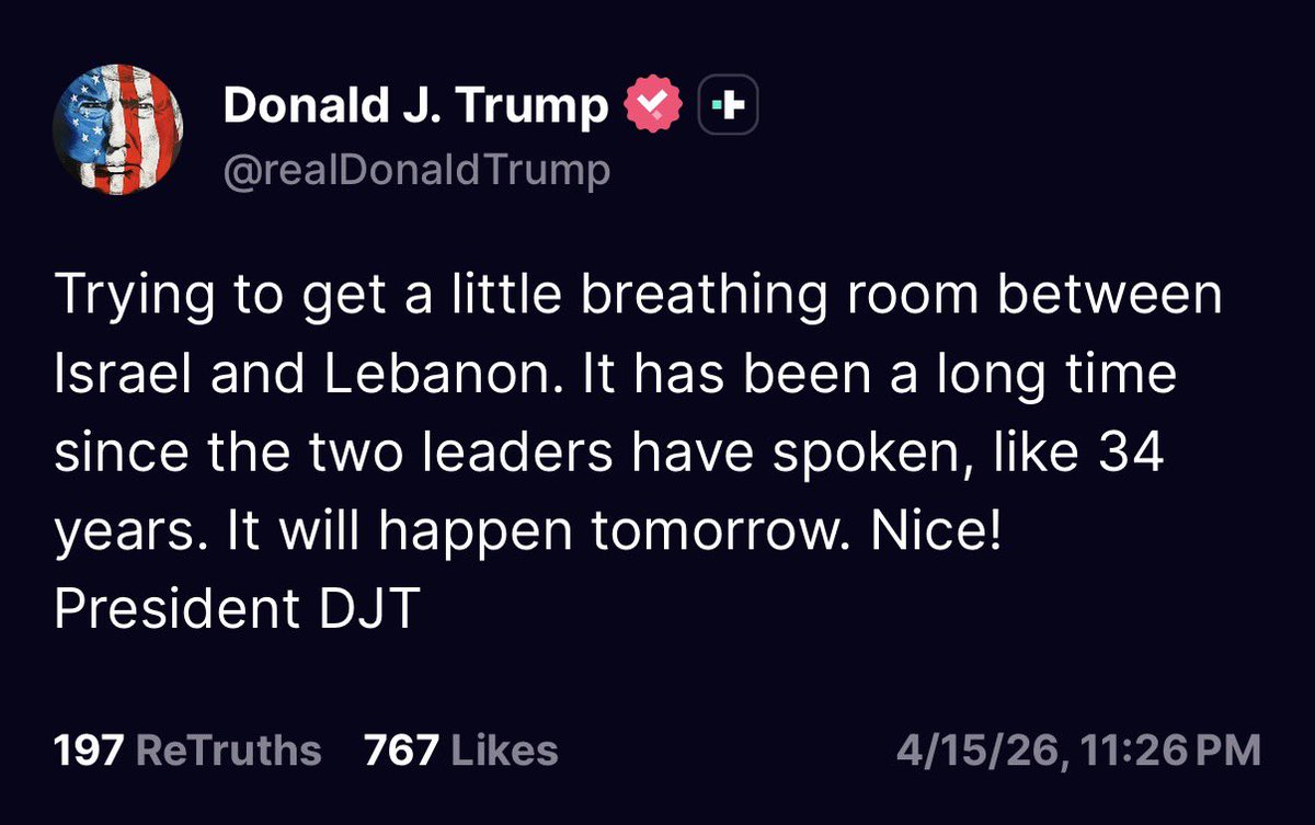 JUST IN: President Trump says he is “trying to get a little breathing room between Israel and Lebanon” and “it will happen tomorrow.”